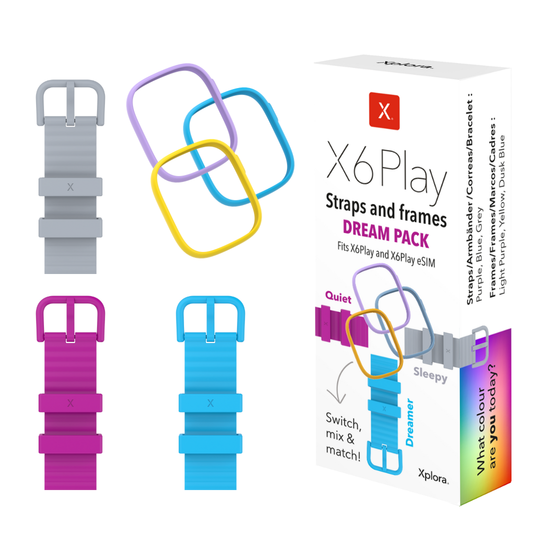 Med det senaste tillskottet Dream-paketet kan ditt barn förvandla utseendet på sin X6Play smartklocka till alla färger som får dem att drömma stort! Detta set innehåller 3 äventyrliga armband, matchande öglor och 3 snygga ramar, vilket öppnar upp för ännu fler färgkombinationer för vårt Byt, Mixa & Matcha-koncept! Låt dina barn släppa lös sin kreativitet genom att blanda och matcha olika färger för att göra deras Xplora smartklocka verkligen till sin egen och spegla deras unika drömmare.